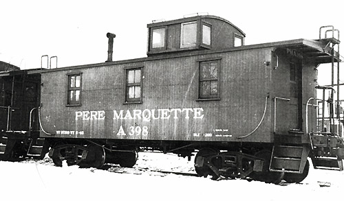 PM Caboose #A398 at an unknown location some time after October, 1943. According to the stencil on this caboose, it was one of the oldest in service on the Pere Marquette at the time, having been built in 1880. This caboose is of a similar design to #A615 shown elsewhere in the photo gallery, but it has a longer carbody, which is just one of several variations among the PM's "three-window" wood cabooses.