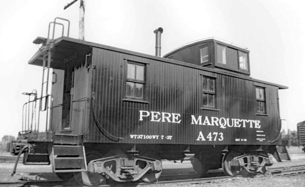 Caboose A473, shown at Hartford, Michigan in 1937, was a fairly typical example of the so-called "three-window" caboose that made up a large part of the Pere Marquette's caboose fleet.