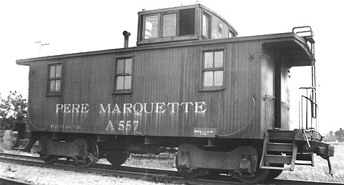 PM Caboose #A557 at Detroit, Michigan in 1939. This caboose was assigned to the Weighmaster, and was usually in the company of the PM's scale testing car, Z-3. This company service assignment helps explain why A557 still has Fox trucks in 1939, since Fox trucks had generally fallen out of favor by the early 1930s.