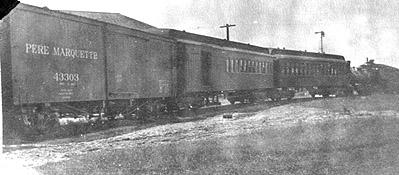 Wooden PM boxcar #43303 with two unidentified wooden passenger cars at an unknown location on an unknown date.