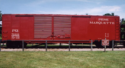 Freshly repainted ex-PM Boxcar #72222 at the Tri-Cities Historical Society railroad display on the south bank of the Grand River in Grand Haven.