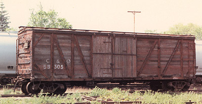 A single-sheathed ex-PM boxcar, originally from the series 88350-89349, at the future site of the Steam Railroading Institute in Owosso, Michigan in 1985. This car was part of a series of 1,000 cars built in 1927 by Pressed Steel Car Company. Although the C&O renumbered this car following the merger, time has worn the paint enough that its earlier PM lettering is visible to the right of the door. During its later years on the C&O, this car was assigned to company service as a Supply Boxcar, hence the "SB" prefix.