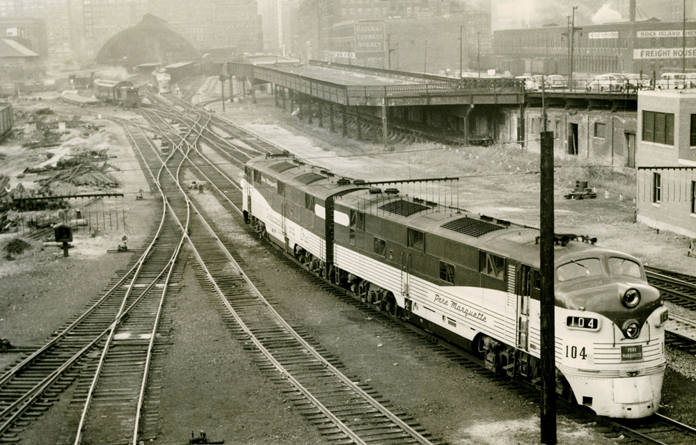 PM E7A #104 and a partner from the 90-series pull away for servicing from the train they brought in from Grand Rapids during the summer of 1949.
