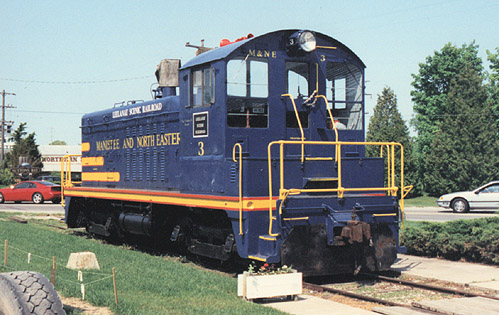 Rear and fireman's side of Ex-Manistee & North Eastern NW2 #3, the last remaining M&NE locomotive, at Suttons Bay, Michigan in August, 1992. At this time she was running for the Leelanau Scenic Railroad, which operated trains between Greilicksville and Suttons Bay on the Leelanau Peninsula, northwest of Traverse City.