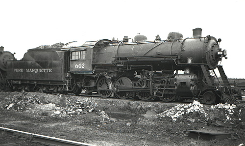 The Consolidation was the backbone of the PM's steam fleet in Ontario. While Mikados pulled the cross-province through freights, the 2-8-0s conducted the local business, especially on the Erieau-Sarnia line.Number 602 is shown at St. Thomas, Ontario in September, 1938.