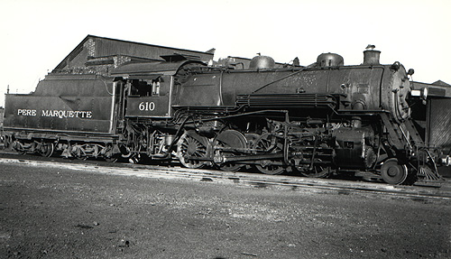 One of the larger Consolidations to serve in Ontario was Class C 2-8-0 #610. It was a 1910 product of Alco's Richmond Works.Number 610 is shown at St. Thomas, Ontario in August, 1939, with handrails added along the top of the tender's coal bunker as required by Canadian law.
