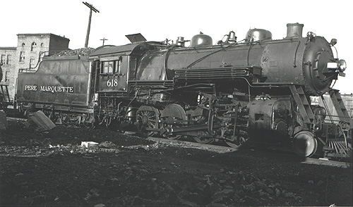 The Consolidations were the core of the PM's roster in Ontario, and one of them was Class C 2-8-0 #618. It was delivered to the PM in 1911, the same year as the PM's last order of Consolidations, the large SC class, were received from Alco.Number 618 is shown at St. Thomas, Ontario in August, 1939.