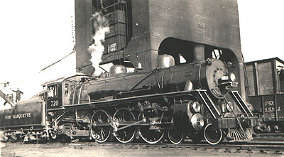 Pere Marquette Class SP-3 Pacific #720 at the coaling tower at Detroit's 15th Street Yard in October,1939.The PM's Pacifics were the backbone of its passenger-hauling fleet right up until the C&O merger in 1947. The dozen SP-3s were the PM's largest class of Pacifics. Number 720 was built by Alco in June, 1921 and served the PM and later the C&O until it was retired in December, 1949.