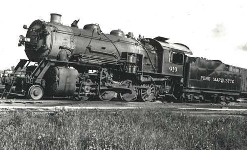 Of the PM's classes of Consolidations, the SC class, #901-925, were its largest and most powerful. Built by Alco's Brooks works in 1911, as a class, these locomotives were for many years the PM's "big power".PM SC Class 2-8-0 #919 is shown here at Muskegon in September, 1938.