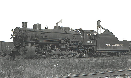 The PM's original 2-10-2s were pretty small as 2-10-2s go. These fifteen locomotives built by Alco's Dunkirk works in 1918 were small in most major dimensions. Most notable when looking at them broadside were the 33-inch pilot and trailing wheels, which were a good ten inches smaller than most 2-10-2s' of the day.PM SF Class 2-10-2 #1108 is shown here at Grand Rapids in November, 1937.