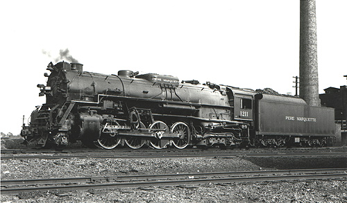 Less than a year old, The PM's eleventh Berkshire, N Class 2-8-4 #1211 sits ready at Ottawa Yard in Erie, Michigan.Nubmer 1211 was one of the five Ns equippped with a booster. It is shown in June, 1938.
