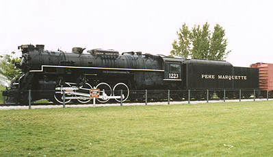 Ex-Pere Marquette Berkshire #1223 on display on the site of the former Grand Trunk Western yard along the Grand River, at the intersection of North Harbor Drive and First Street.The Pere Marquette 1223 Preservation Committee, working under the auspices of the Tri-Cities Historical Society, spent many years of hard work cosmetically restoring #1223. Presently, #1223 and her consist are a very handsome display.