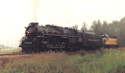 Michigan State Trust for Railway Preservation's ex-PM Berkshire #1225 south of Chesaning, Michigan on the Tuscola & Saginaw Bay's ex-New York Central St. Charles Branch on the first day of road testing in September, 1988.On this overcast day, #1225 ran between Chesaning and Owosso, until a leaky superheater sidelined her for the day.