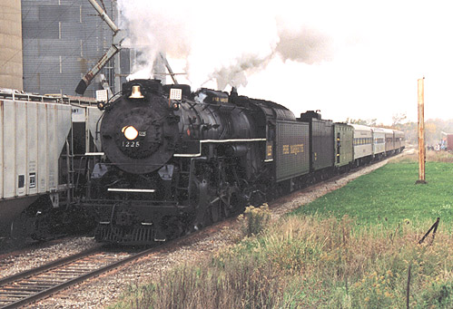 Michigan State Trust for Railway Preservation's ex-PM Berkshire #1225 entering Shepherd, Michigan on the Tuscola & Saginaw Bay's ex-Ann Arbor line.During the MSTRP's excursions in 1999, #1225 operated between Owosso and Clare on former Ann Arbor tracks. She is shown here entering the north side of Shepherd during the drizzly return trip to Owosso.