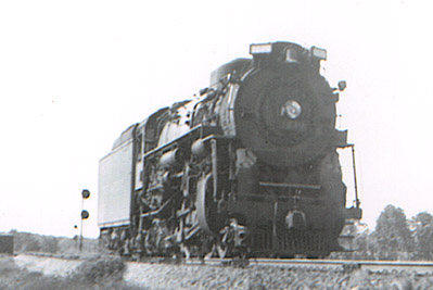 Pere Marquette Berkshire #1239, the last of the PM Berkshires built, sitting on the siding at New Richmond during the summer of 1948.The stiff 1.23% northward grade beginning just north of this location and extending to East Saugatuck made it necessary to either use helper engines or to double the hill. Number 1239, a Class N-2 built in 1944 for the PM, spent part of its service life in helper service at New Richmond. It was retired in the early 1950s and scrapped in 1961.