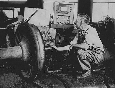 A wheelset's axle is electrically tested for defects at the car shop at Wyoming Yard in April, 1954.Photo by John R. Milhaupt
