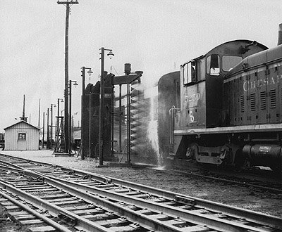 A C&O switcher brings a string of streamlined cars through the car washer at Wyoming Yard in April, 1954.Photo by John R. Milhaupt