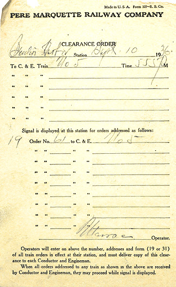 On the clearance would be listed all of the orders being issued for a given train at that station. This clearance indicates that Train #5 (the southbound Chicago Limited) was issued train order number 61 at Benton Harbor, Michigan on September 10, 1936.