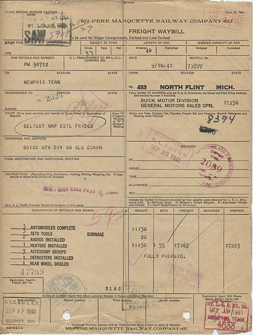 This waybill, issued on September 16, 1941, is for shipment of three new Buicks from the General Motors plant in Flint, Michigan to a GM sales agent in Memphis, Tennesee.Loaded into PM boxcar #90712, the automobiles would traverse the PM to Belfast, Indiana, on the PM's LaCrosse Branch, where the car was set out for the Nickel Plate, which took the car to East St. Louis, Illinois, where it handed the car over to the Frisco for movement to Memphis. The various stamps on the form show how it progressed along this route.