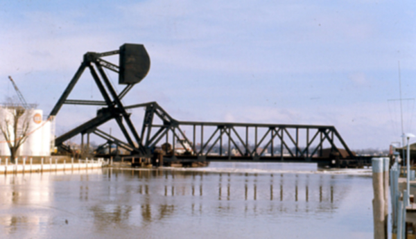 A seldom-seen shot of the PM's Black River drawbridge in Port Huron in the closed position. Taken in 1972, at approximately the time that the C&O discontinued service north of the river. It continued to be lowered to allow head room for switching moves in the adjacent yard to the south until 1980.